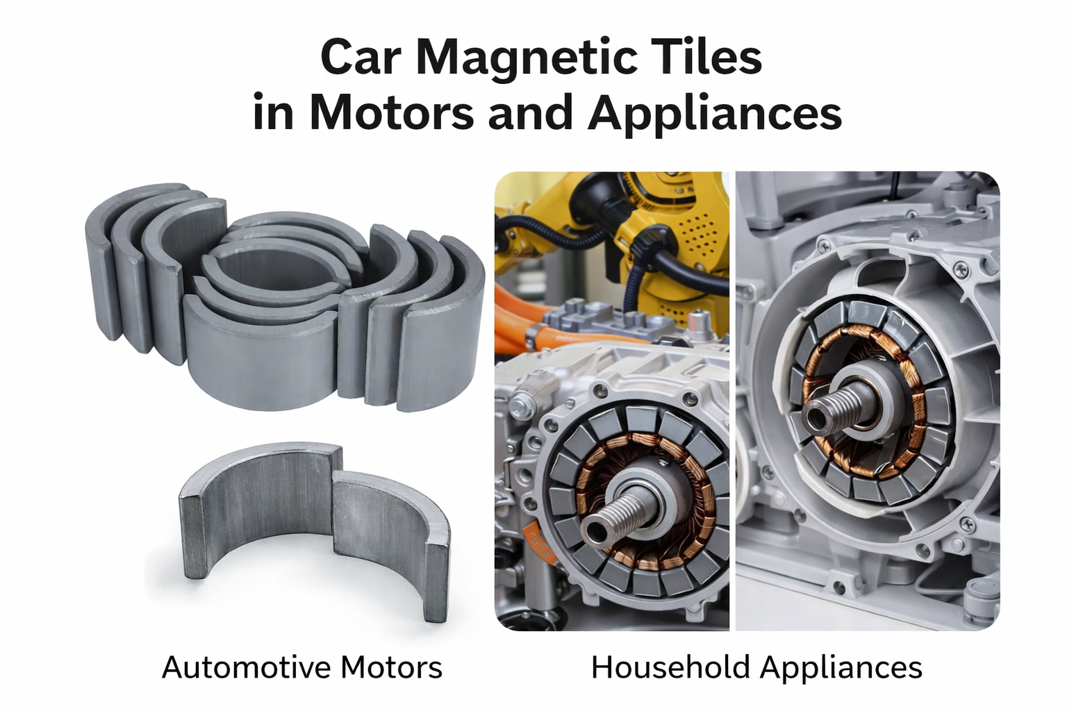 Beyond end products, magnetic tiles are also used in industrial environments related to automotive and appliance manufacturing. They can be found in motor testing equipment, automated assembly lines, and material handling systems. In these settings, magnetic tiles may serve both as functional motor components and as magnetic holding elements that assist with positioning metal parts during production.